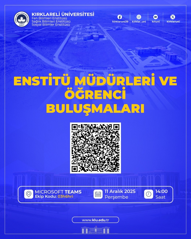 Etkinlik, 11 Aralık 2025 Perşembe günü saat 14.00’te, MS Teams Platformu üzerinden online olarak, Fen Bilimleri Enstitüsü Müdürü Doç. Dr. Hayrettin TOYLAN, Sağlık Bilimleri Enstitüsü Müdürü Doç.Dr. Betül ÇİFTÇİ ve Sosyal Bilimler Enstitüsü Müdürü Doç.Dr. İskender GÜMÜŞ'ün katılımlarıyla gerçekleştirilecektir.